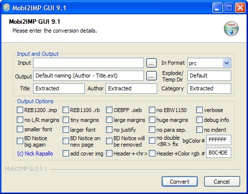 Just download, unzip and install the Mobi2IMP-9.4-Installer.zip attachment followed by the updated Mobi2IMP.exe dos executables in Mobi2IMP-9.4e.zip. Please read the EDIT at the bottom of this post for more information. Mobi2IMP converts non-DRMed Mobipocket .PRC/.MOBI and PalmDOC .PDB files directly to .IMP formats (i.e. EBW1150 .imp, REB1200 .imp, REB1100 .rb and/or OEBFF .oeb/ETI .epub). This project was created by Nick Rapallo and was inspired by PDFRead's .IMP creating module (ImpOutput) by Ashish Kulkarni and 'mobi2html' in Mobiperl by tompe on mobileread.com. Changes in this release: