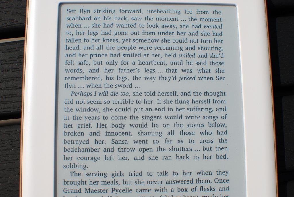 First of all the screen is simply just great. The high resolution really makes a difference. The text is very crisp and clear. IMHO the contrast is comparable or slightly better than on the e-ink pearl readers I have seen but the increased resolution really makes all the difference. I haven’t had the opportunity yet to compare it side by side with the kindle but compared to my Cybook opus (visiplex) it’s great. It's hard to take a good photo of the screen but here's an attempt... The page turns are very fast. It seems that the HD does a full page rendering for every page turn yet it still very fast and there is no visible ghosting afterwards. Overall it loads the books quite fast; it takes a few seconds to load a book and 1 or 2 seconds to get back to the main menu. Navigation works fairly well. Page turns is controlled by the silvery 4-way switch in the middle, which allows for left/right/up/down navigation. I would have appreciated buttons on the side of the reader as well now you’re more or less forced to hold it in the bottom and it can be a bit difficult to turn the pages sometimes. A nice surprise was that the Story HD handled pdfs very well. I loaded up a couple of large research papers of > 2M file size and they were rendered fast and without errors. Page turns were very quick here as well. I haven’t tried any comic book files but since they worked nicely on the Story Cover I assume they will work here as well. The software is at 1.0 as a bought it and it does not have that very many features. Still you’re greeted with a rather nice menu screen which shows an excerpt and the progress in the book you’re currently reading. You can also see a selection of books in your library as well as a bookmarks and found words list. Inside a book you have a selection of font sizes and so on as well as a dictionary lookup function. The dictionary was a disappointment for me since you can’t mark the word you want to look up but you have to type it in with the keyboard. What’s up with that? There are also a few bugs in the software a few times the reader has gotten stuck on some sort of page turn loop, where it just kept turning pages over and over, but a press of the home button got me back to the main menu. Some epub files also seem to be displayed incorrectly with line breaks within quotation marks not working properly. It would be interesting to hear other users experience with the Story HD especially if somebody can find the wifi version (if it exists). Since the lack of media interest/pr from iriver it will also be very interesting to see how much effort will be put in firmware updates and development. I feel that this reader has a lot of potential and it’s a good reader of you like me want a great screen and do not care about touch/wifi/social functionality. Last edited by perma; 06-30-2011 at 03:33 AM. Reason: removed inline image text |