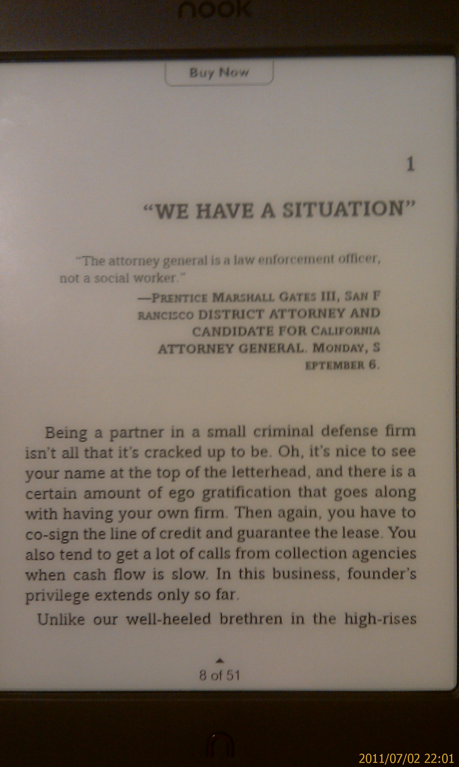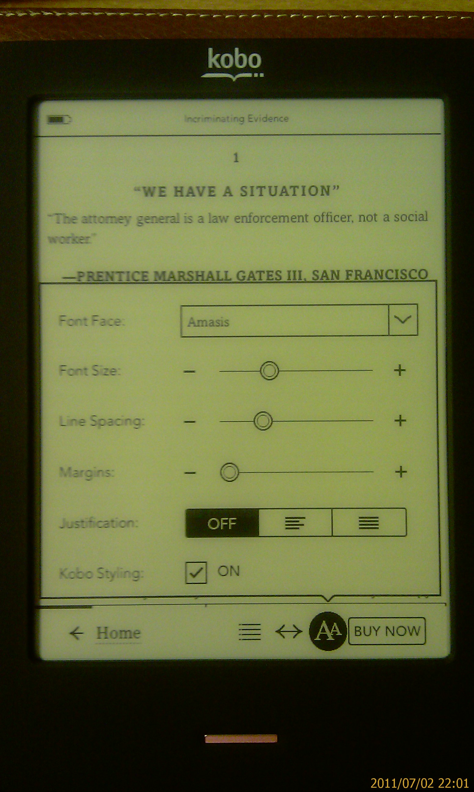 Home screen looks better in person. When looking at the videos I kept thinking it was too plain (compared to NOOK). At first glance one may prefer the NOOK's home screen, but after using the NOOK many don't care for it, and avoid it. While I was typing this, it went into sleep mode. A book cover is displayed with the percentage read underneath. The image doesn't take up the full screen. I saw a post in the Kobo forum requesting a bigger image. Maybe we'll see this change. The Kobo wins hands down for rendering text in the most eye pleasing manner. The latest update propels them to the forefront. it's unbelievable how you have granular control over margins, line spacing, and font size. The Kobo has spacing between paragraphs, which I thought would be a negative. You don't sacrifice word count because you can fine tune line spacing and margins to a greater degree than the NOOK. I've attached pictures comparing the same book with same font style (Amasis). The margins on both are set to the smallest setting. This book on the Kobo is much more visually appealing to me. Last edited by SCION; 07-03-2011 at 12:12 AM. |