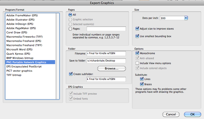 ----- BTY Cali - I went to that page you suggested already and yes, I'm on Mac. ----- I'm not sure if I need the Command Line Tools. It says: Convert an ebook from one format to another. When they are installed, how do you access Command Line Tools? Is it then part of the interface once it's installed? ----- I have a 96 page book in PDF I am looking to put into Kindle. I found out the hard way (my Kindle Pub account) that PDF is garbled. I don't want to convert my book to Word. I will probably reset my margins (I have some help with that on the Sibelius website) and export my book as a PNG. I don't think mobipocket is made for Mac and the interface wasn't as clear as Caliber anyways. Even the "Help" manual in Caliber looks sophisticated ![]() My graphics export options on Sibelius are in the attachment. Any ideas which would be the best choice for uploading to Kindle? As I said, I'm guessing PNG. Many thx! ------- PS - If I should start a new thread or post elsewhere, please have a moderator contact me and I will delete this post and post to the proper area. Perhaps in "Library Management"? I can't tell what section I'm in from what it reads up top left on my screen: MobileRead Forums > E-Book Software > Calibre Last edited by Riqiv; 07-05-2011 at 01:01 PM. |
