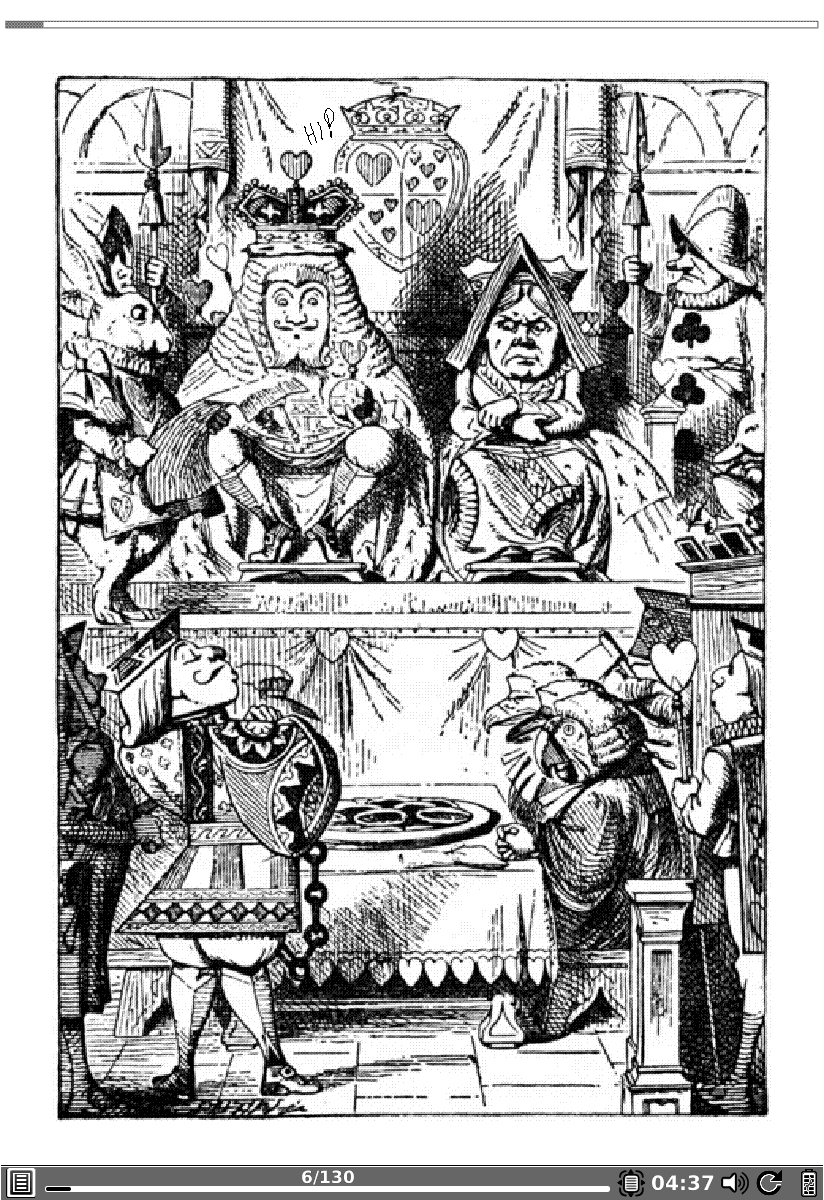 If you have and SD card in the device you can take a screenshot of the page you are on by pushing the middle of the volume rocker so that it pushes both + and - together. If you get the speaker icon on screen you havent got it right. these are stored on the SD card in the "snapshot" folder which is created the first time yo take a screenshot here is an example showing the small margin note i made near the king in this page from Alice, using zoom in, write and then zoom out |