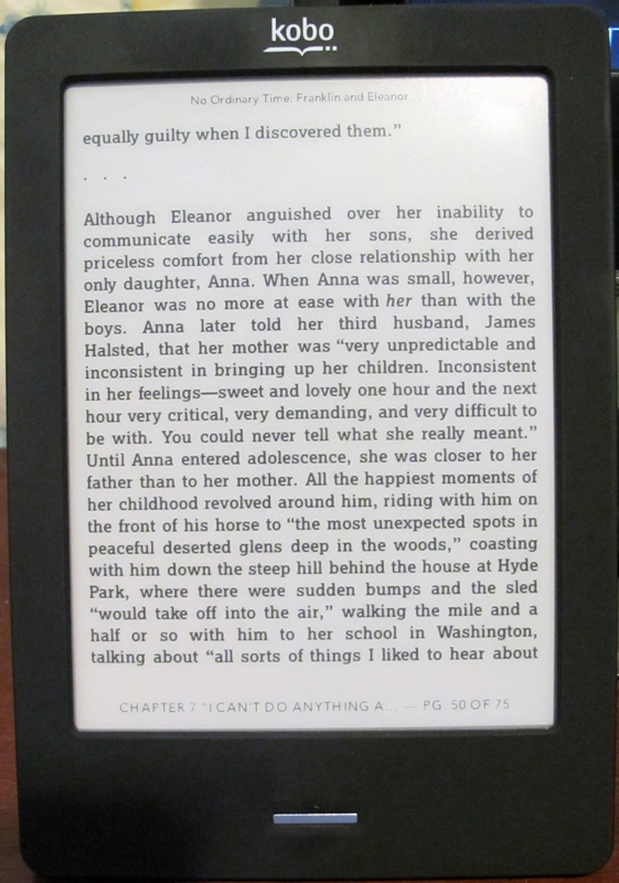 I am a speed-reader. I was once been tested reading newspaper material at 3000 wpm, with excellent comprehension. I've also developed Postscript fonts and scalable logos for both low-res displays and high-res printers, and have taught classes on the topic. I state this simply to point out that I know a bit about type. I'm also on my third e-reader. I have a K3, a Nook STR, and now a Kobo Touch, so I can easily make comparisons between these three current products.