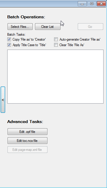 • There is also an advanced pane which contains some batch operations and the ability to view and edit the OPF and TOC.NCX files.