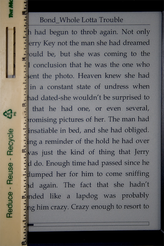 You can load any TrueType or OpenType font onto the machine, and view any book in any font at any of 12 different font sizes; I've illustrated the smallest and largest in the photos above (well, technically the next to smallest - the very smallest is the same size text, with wider margins). You can read PDF docs in landscape, but not (at least with the current firmware) Mobi books. |