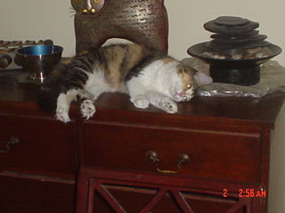 Ok, here's some of ours: The orange longhair is Buddy, the original slacker kitty, and the Siamese is, of course, Sinatra.