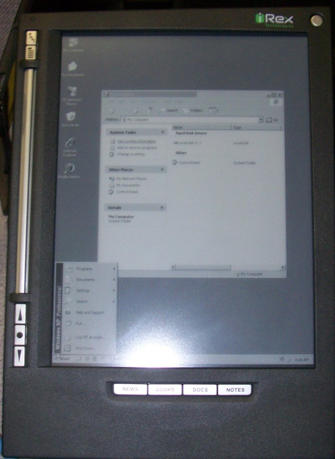 I've been able to successfully port Windows XP to the iLiad! This has been a project a long time in the making. A lot of people complain about the lack of functionality of the iLiad OS. Linux is great, but there aren't a lot of good application choices for it. So Windows is the obvious solution. With windows running, we can run a full featured Firefox, Mobipocket Reader, Adobe Acrobat, even Outlook! It doesn't run very fast, and I had to modify XP's boot sequence to work on the iLiad, along with a custom display driver. But overall, I think there's a lot of potential. Here's a video of it booting: There are some more screenshots and pictures attached. |