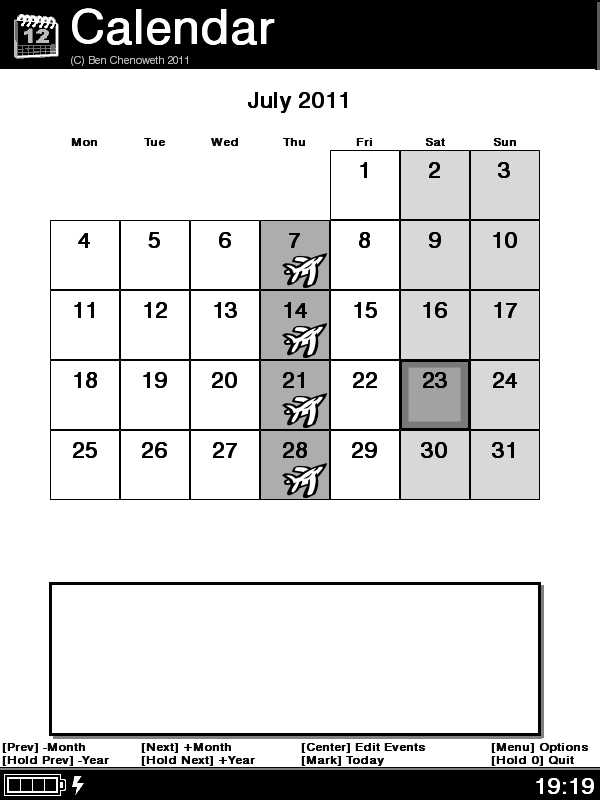 Y;1;1;1900;12;New Year's Day Y;2;14;1900;6;Valentine's Day F;3;0;0;14;Easter Sunday Y;3;17;1900;10;St. Patrick's Day F;11;4;5;11;Thanksgiving Y;12;25;1900;5;Christmas You can change the icon from within the app itself, so the easiest way to update your existing file would be to connect your reader to the computer, edit the calendar.dat file, add "3;" before the description of each event, and then disconnect the reader. When you start the calendar app, you can then click on each event, and change the icon. This should work on non-Touch as well. It hasn't been extensively tested, so if you find something odd, please let me know. Sincerely, Ben. |