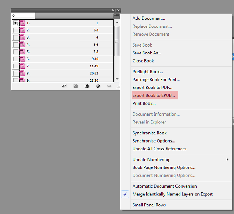 Reading the thread, perhaps you still don't have an answer. I see you are using InDesign CS 5.5. One method is to create lots of mini documents within InDesign, IE break your Document up into logical smaller documents. Then you create a book in InDesign and all your smaller documents then are added to the book. I can guarantee you that when InDesign exports the book to ePub, each document will start on its own page. If you try this method, you can't use the File -> Export method. Instead on the Books window in the top right hand corner, you select the down arrow and from the drop down list select export to ePub from there. This had me stumped for a few minutes a couple of weeks ago.  I'm not sure why people say you iBooks on the iPad and iPhone wont recognise page breaks from the CSS. I've done it, I do it every day and it works, I promise you. Here is a sample of my CSS and note the last line. p.Header { font-family : "Qlassik Bold", sans-serif; font-weight : bold; font-style : normal; font-size : 2em; text-decoration : none; font-variant : normal; line-height : 1.2; text-align : left; color : #d90000; text-indent : 0px; margin : 0 0 4em 0; page-break-before: always; } So everything tagged in the XHTML as a header ie: <p class="Header">Logbook 463</p> has a page break before it. I've attached some images to show that it works. Also an image showing the menu you use from InDesign to export a Book to ePub. I'm happy to send you some of my XHTML and CSS if it will help? |