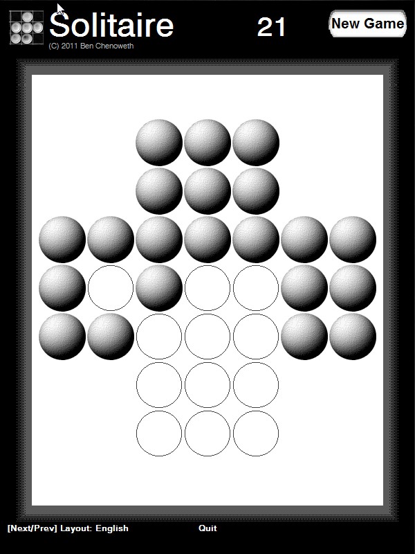 I've just pushed a new game to the app repository: Solitaire (or Peg Solitaire as it is also known). If you find anything, please let me know. It should work with both Touch and non-Touch readers. There are three layouts built in: English (this is the default one that I am used to!), French (or European), and Square (I don't even know if this is solvable!) Click on a marble to remove it, and then start jumping! Most people remove the center one, and the aim of the game is to be left with one marble in the center position. Good luck! Sincerely, Ben. |