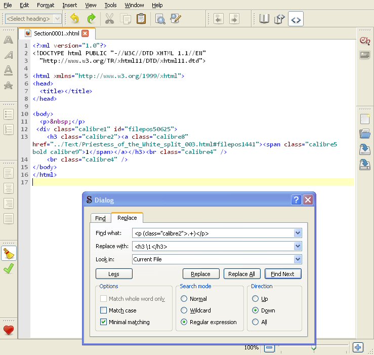 I pasted your code into Sigil 3.4 and My terms into the S&R.