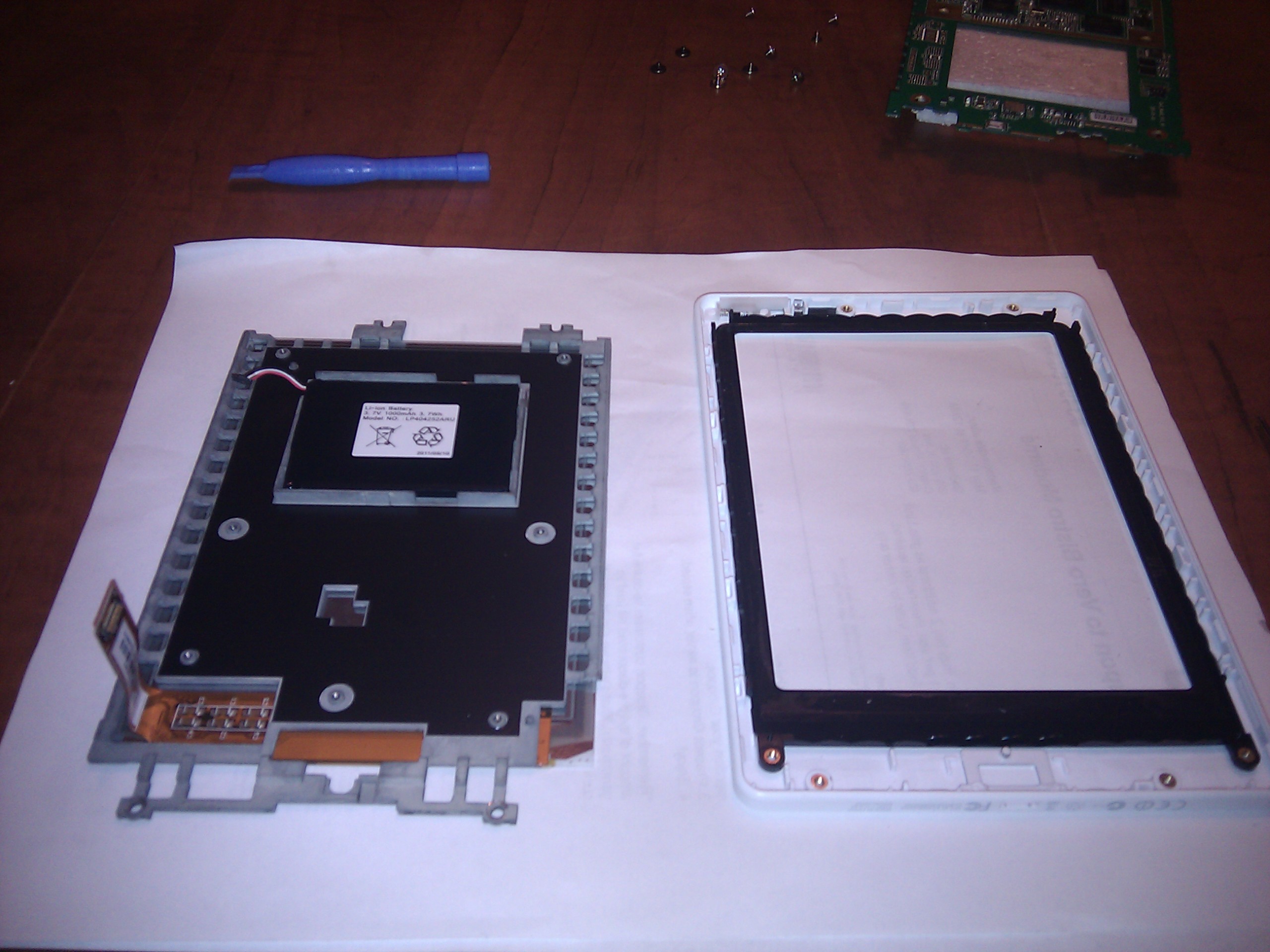 I am getting a little tired of my plain white kobo so I was thinking about maybe giving it a nice custom paint job. In anticipation of that I decided to see how hard disassembly would be. Turns out it was pretty damn easy. Pry off the back cover and remove 11 screws and you are in business.