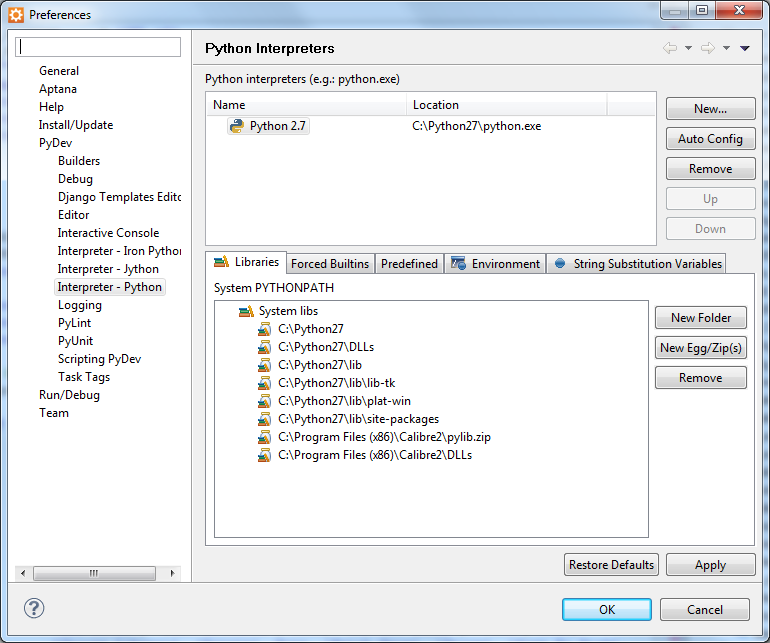 However I am completely and utterly lost to get this up and running. I have tried various combinations of "new folders" and "external libraries" and nothing I have tried gives me a combination that allows me to browse the source code with code analysis working. Clearly this must be down to my ignorance. Would anyone please be so kind as to give a step by step breakdown as to how to get an Aptana workspace up and running for working with Calibre? You can assume I have done the following: