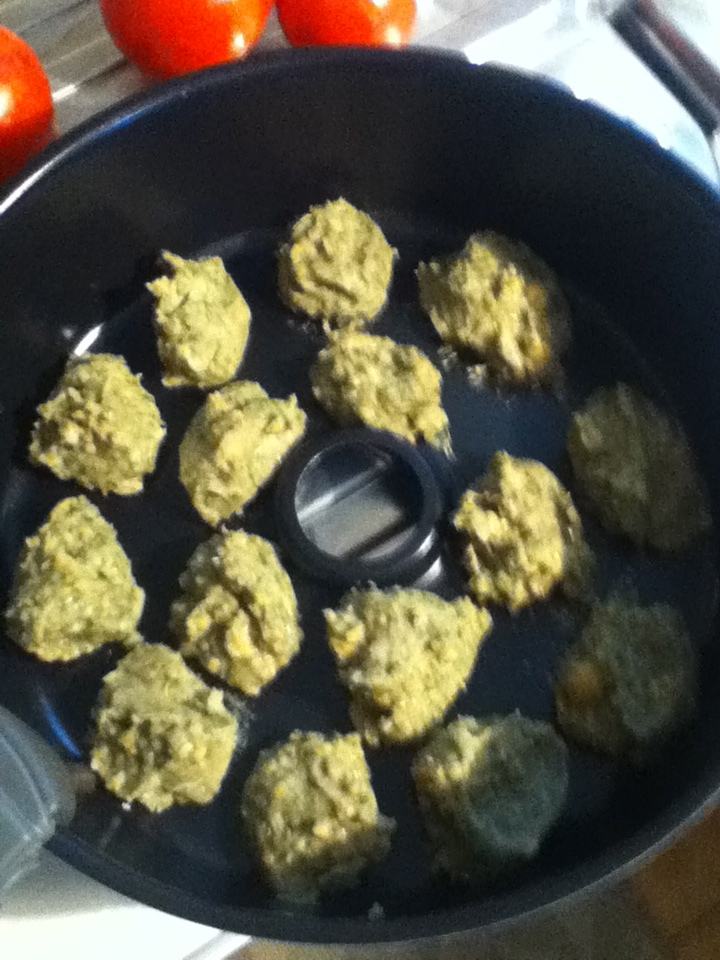 I did them for lunch and they encountered the favor of my two resident angel/devils. The ingredients do not matter. Let's see how I cooked the bean patties. Let's call them so, although they are actifried falafel. a) I took away the rotary wedge. I spooned the stuff like so b) 10 minutes of actifry. I took them out, repositioned them with the soft part up, like so c) 10 minutes again and they were just perfect (IMMO, of course). You can see how they went on the table, with a Greek yogurt and dill sauce (few drops of lemon juice). I used chickpeas, white beans, plenty of coriander, some caraway seeds, 2 garlic cloves, a small red onion, a big batch of basil, and fresh savory, salt and baking powder. I tightened up the mix with some flour. Ah yeah, some lemon juice. No pepper or arissa or anything strong because of Little Daughter. We had a big crisis at the table, because after she had 2, she wanted all the remaining 4 on her plate, the little rascal. I did not give in. I served them with tomatoes and thinly chopped chicory salad from the garden. A glass of Sauvignon. |