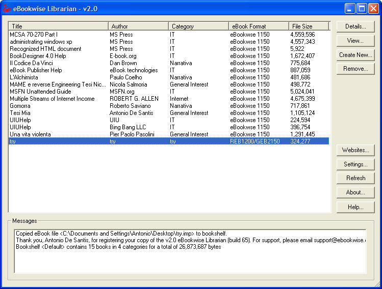 According to me, there are two little bugs in versione 1.6: 1) when I make an ebook the generated file hasn't extension. for example lrf for prs500 imp for Reb1150, etc. 2) I have tried to make an ebook in eb1150 profile. the ebook is created but eBookwise Librarian recognize it like REB1200/GEB2150, so I cannot see this ebook in reb1150 bookshelf. |