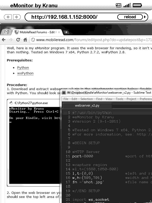 2. Open the web browser on your Kindle. In the address bar, type in the URL displayed in the Python window. If all goes well, you should see the top left area of your computer screen.