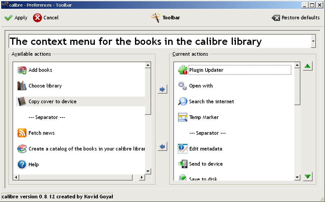 Now, if you highlight a book in the library window and right-click you should see Copy cover to device on the list of actions. By the way, I have customised a few of my Calibre icons so don't be surprised if yours look different. The little brown book icon should be the same though. Does this help?