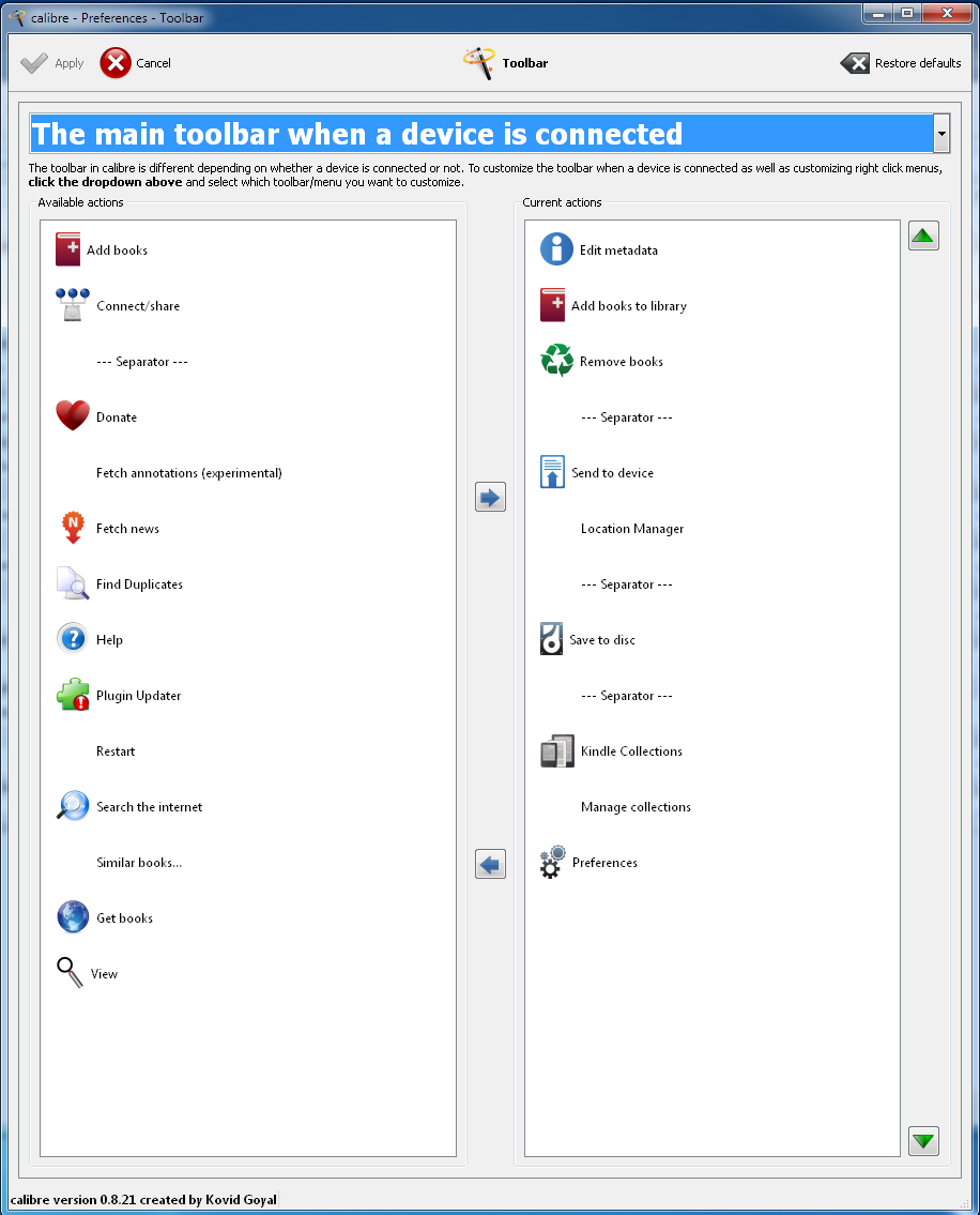 Some of the restrictions doesn't make sense to me. After transferring books to my kindle, I often make a new version of the catalog of books I keep on the device, so that it's updated as well. Some time ago I tried to add "Create catalog" to "main toolbar when a device is connected", and was I little surprised that I couldn't. I do have "Convert" showing, and using the dropdown-menu is only an extra click, so not a problem, I'm just a little curious as to why it's restricted.
