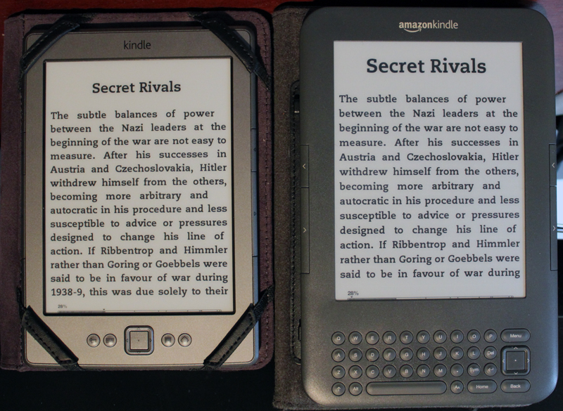 Here's the screen variation that you can see even in the Kindle Keyboard. Note the one underneath is a *newer* Kindle Keyboard purchased in 2011, the top one is an older Kindle Keyboard purchased in 2010. The older one definately has a "whiter" screen, I can see it with the naked eye.