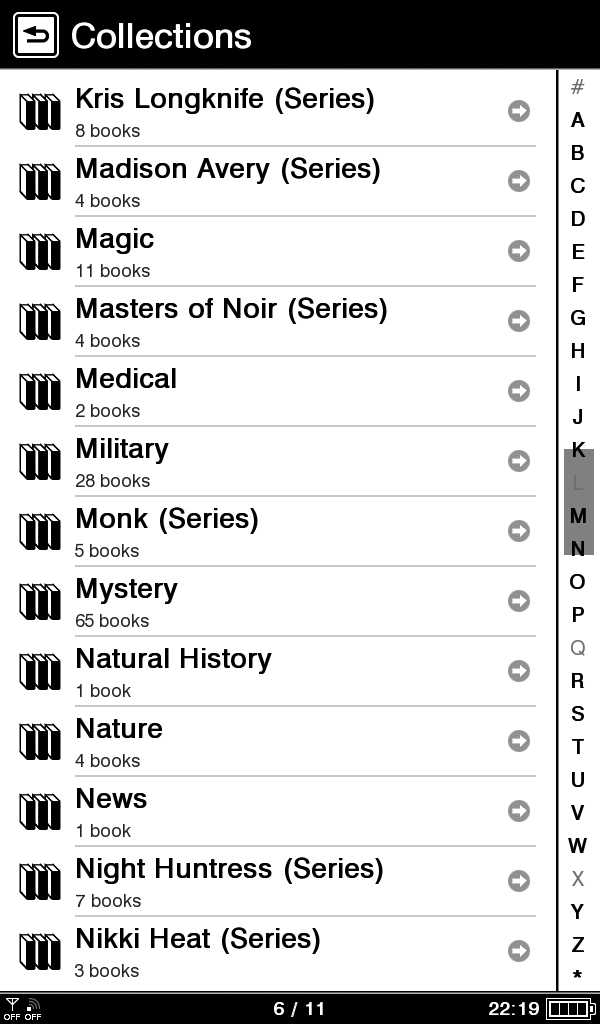 I would normally like to sort into multi level collections, but believe the T1 doesn't do this. ie. type/genre/author/series (eg. Fiction/Fantasy/David Gemmell/Drenai)
