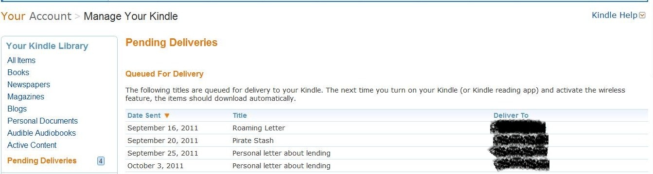 Did anyone else get the "Personal letter about lending" from Amazon when they first tried library lending on the Kindle? I've received 2 so far and I have no idea what's in the there because they're not being delivered to my Kindle; they're just sitting there in the Pending Deliveries queue. Actually, I have 4 items (image attached) in this queue that just refuses to be delivered to my Kindle