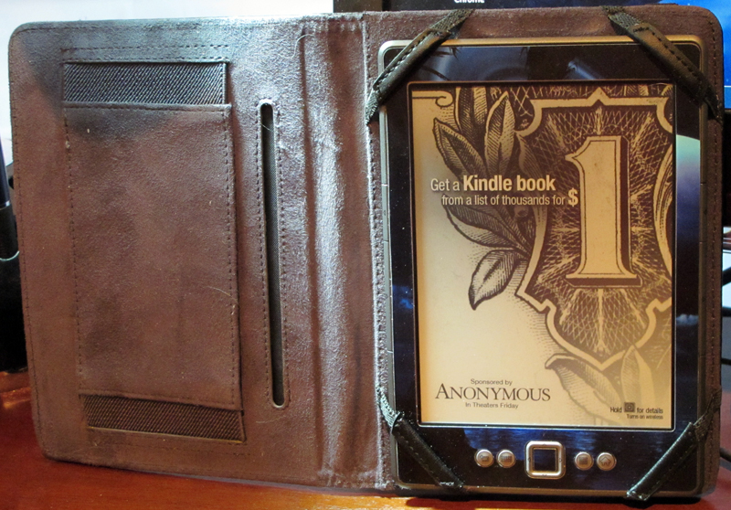 EDIT: And I just noticed the $1 book special offer is shown on the screen! As you can see the Marware cover is NOT the best quality as far as craftsmanship. It gets the job done--protects and tightly secures the K4. But the cover looks a bit rough when opened. I would have gone with an Amazon cover had they been available. .... Last edited by jswinden; 10-24-2011 at 06:48 PM. |