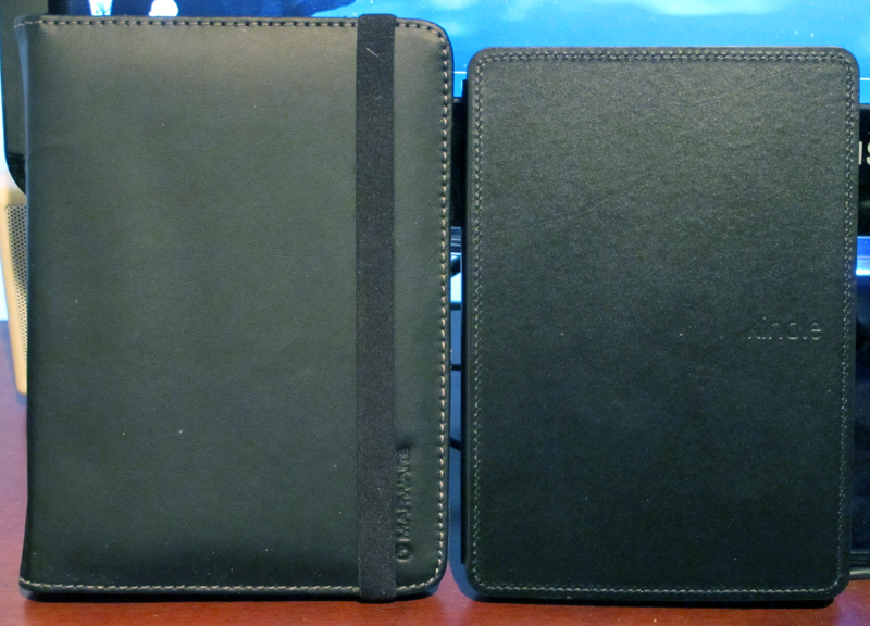 Although the quality is somewhat below that of the Kindle cover for the K3/KK, it is still a good quality. The cover is very light weight and it fits the K4 NT like a glove. The K4 is held in place by a molded rubber and plastic cradle that looks good and works very well. This cradle allows for a secure K4 and takes very little space so it keeps the case streamlined and small. Over all this is a very nice looking, very functional, and pleasantly small and lightweight case. It does not have a mechanism for keeping the front cover closed like the K3/KK covers. Some might like this, others not so much. I must admit I would have preferred an elastic closure band, but it is okay without one. I really like the holding mechanism. I hate those covers that use elastic straps at the four corners. This mechanism is very elegant compared to those. I also very much like that this case was specifically sized/designed for the smaller K4 NT rather than being a larger case designed to also work with the larger K4 Touch. I've attached a few photos of the cover. Two of the photos show how small it is compared to the larger Marware cover I own. .... Last edited by jswinden; 11-04-2011 at 12:46 PM. |