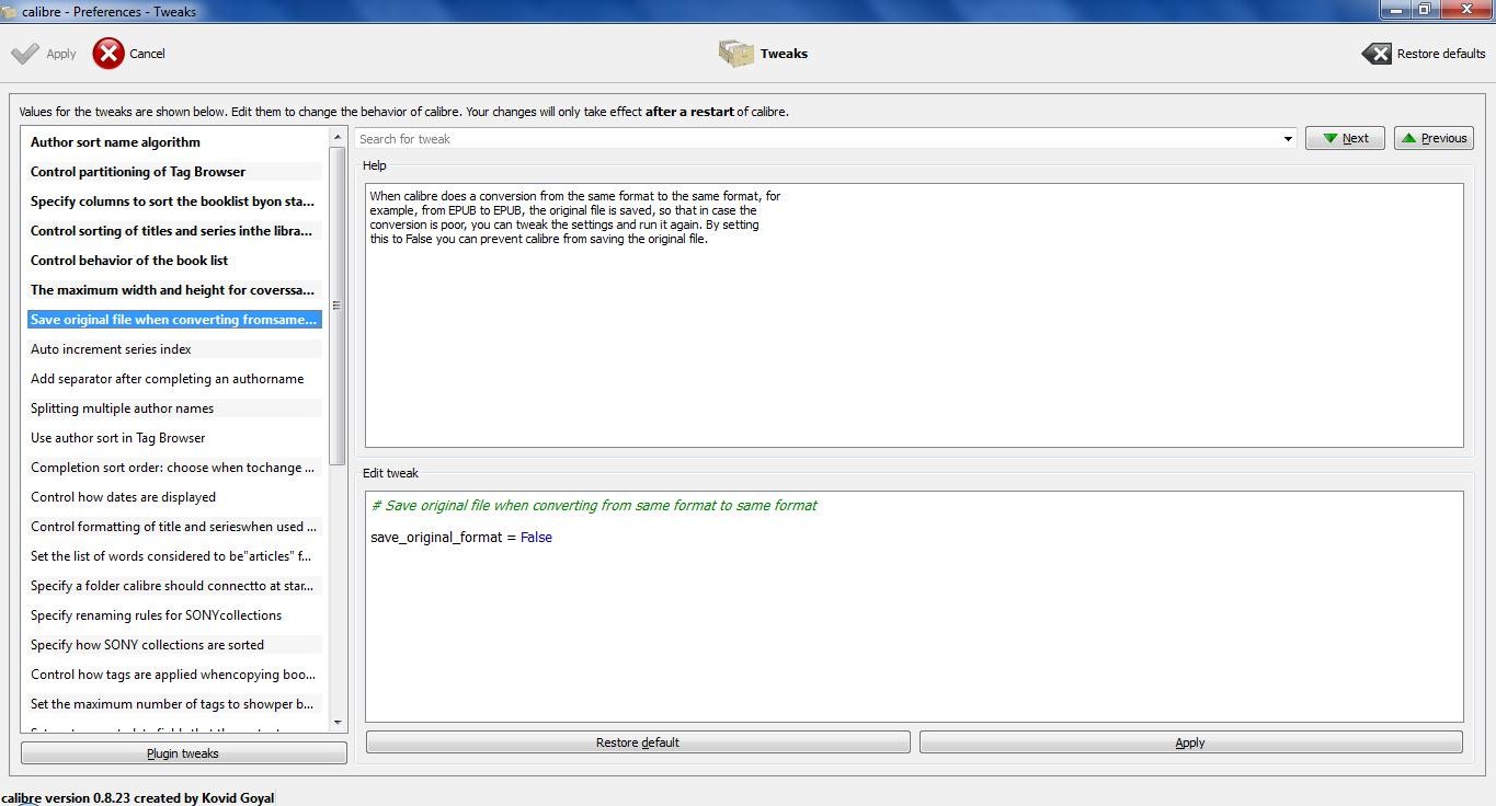 I only keep original files in Calibre when the format is PDF; everything else gets deleted. | |