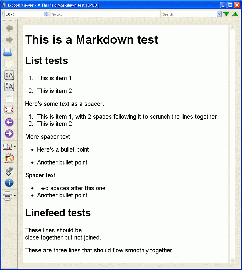 # This is a Markdown test ## List tests 1. This is item 1 2. This is item 2 Here's some text as a spacer. 1. This is item 1, with 2 spaces following it to scrunch the lines together 2. This is item 2 More spacer text * Here's a bullet point * Another bullet point Spacer text... * Two spaces after this one * Another bullet point ## Linefeed tests These lines should be close together but not joined. These are three lines that should flow smoothly together. Here's BBEdit 10's preview, which looks fine: ![]() After doing a Txt --> Mobi conversion in calibre, this is what the Mobi viewer shows: ![]() And here's what it looks like on the Kindle 3: ![]() I see these problems:
