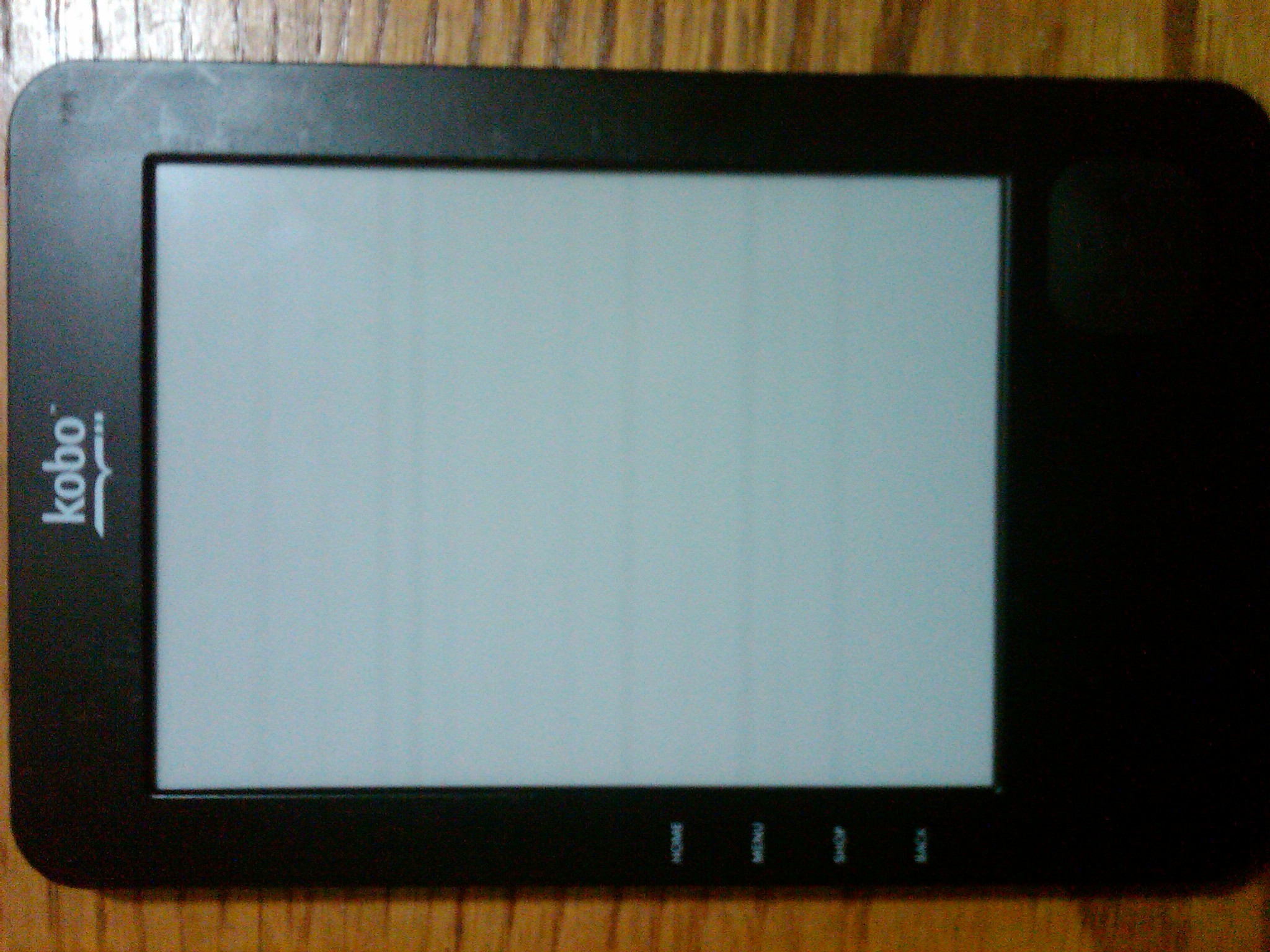 Last night, I sat my Kobo down for a minute and when I picked it up, the screen had no text, but faint lines running horizontally across. The software appears to be responding to button pushes, but the screen only displays more lines. Here are some pics: |