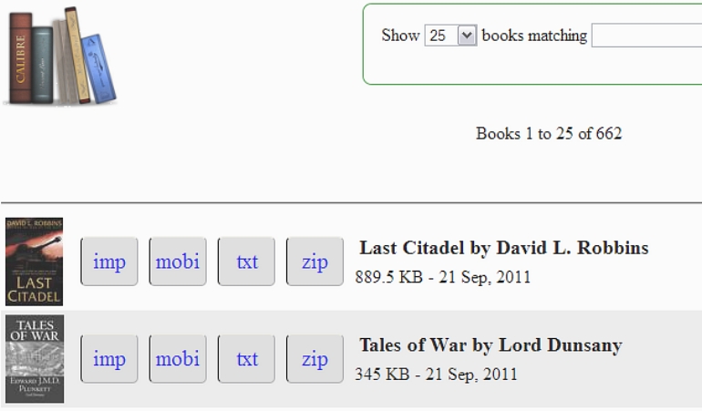My problem is this: The preferred output format preference seems to govern the default "get" format in the content web server. I have a medium sized calibre library with around 200 ebooks. I have been experimenting with the web content server as I have a small group of friends I share books with. I have a kindle myself, so the preferred output format is set to mobi. But some of the friends in my group have ipads and I have found that the calibre web content server is the most effective way of getting ebooks from calibre onto an ipad. Most of my group that have ipads use ibooks to display ebook content so they need epub formatted ebooks. My library contains both mobi and epub formatted ebooks. Even though, the book selections offers epub as an alternate choice, it is sometimes buried at the end of the meta-data display. The "get" button seems to be tied to the preferred output format on the server which in some ways does not make sense. It seems like this choice should be made by the person who is browsing the content server output. Would there be any way to do this? Thanks, JimBushWhack |