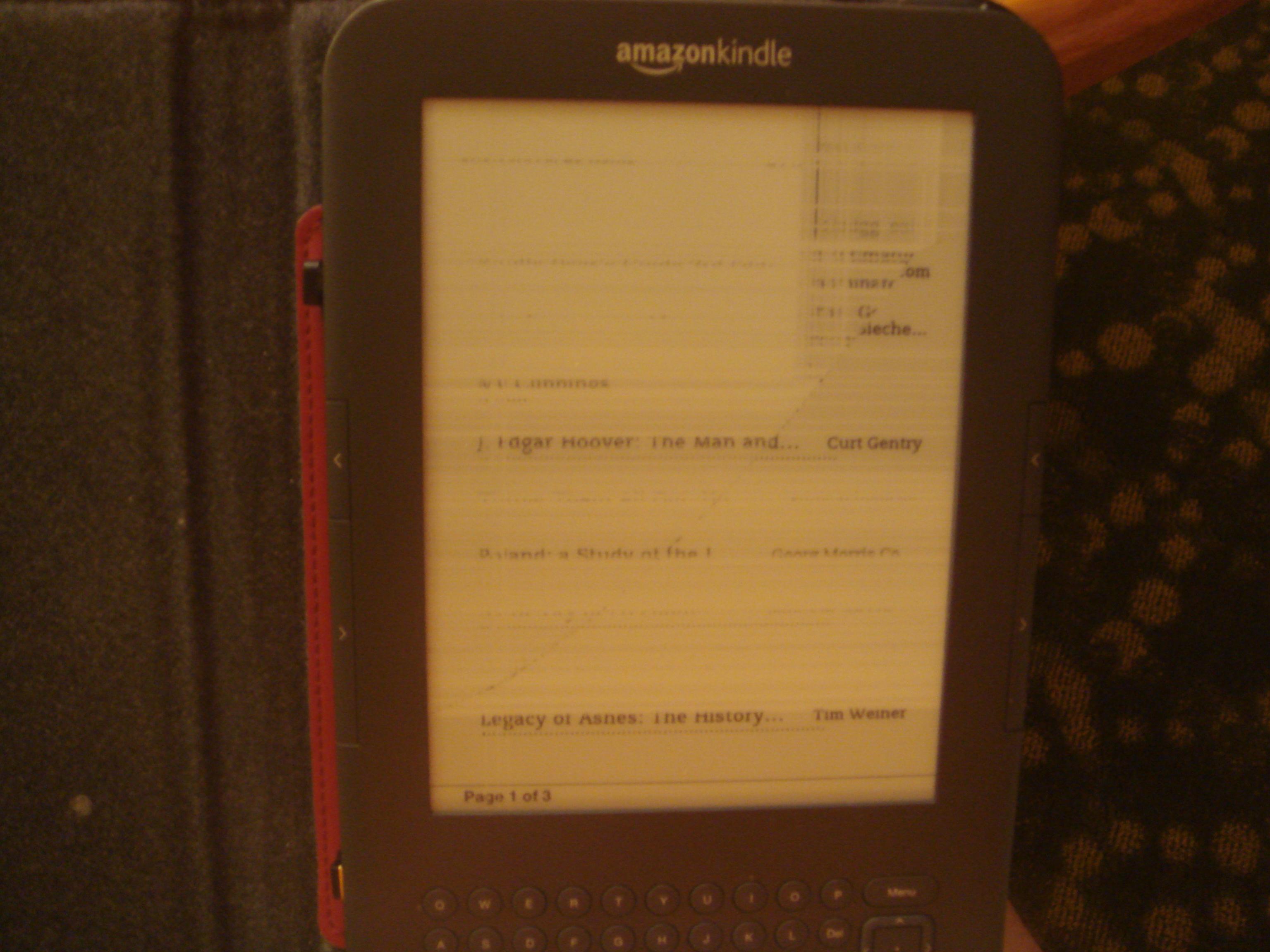 Can anyone offer assistance? I was in a car reading a book on the Kindle (not driving of course!!) and put it down on the seat, after closing the cover, when we stopped for coffee. When we got back on the road and after a few miles I picked up the Kindle and I noticed that part of the screen (top) looked like a prior page was "burned" into the display. It's even there when the book is off. Since then, it has gotten bigger to the point that 90% of the screen is unuseable. Any assistance in contacting Kindle would be greatly appreciated. Thanks. |