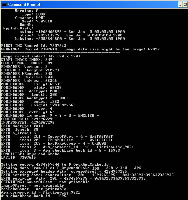 Anyhow, I'm hoping that the smart people here can tell me how to add cover art to these mobi files. I tried using mobi2mobi but that didn't work at all. I have version 0.0.38. Mobi2mobi warns me that the image is too large (it's 228 x 340 so I don't understand that warning) and theres many lines of other text most of which is meaningless to me.