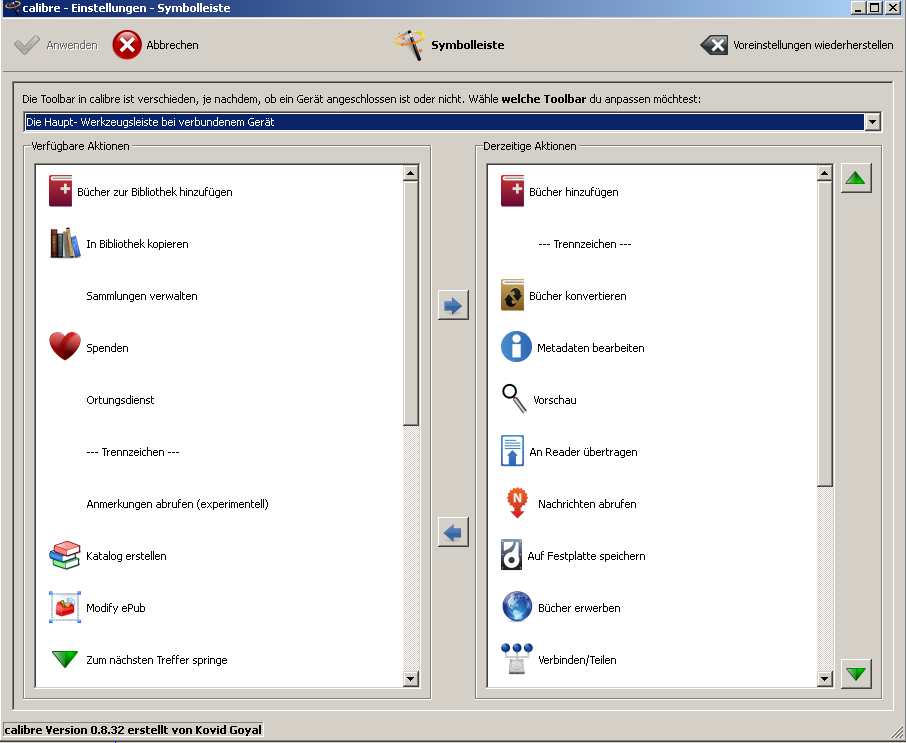 I did this already, but the device icon don't appear, when T1 is connected. When i go back to Preferences: Toolbars Select Main toolbar when device connected Ortungsdienst is back on the left column. I click restore default button again, afterwards ortungsdienst is in the right column, i click apply. Close options, no Device icon. I can do the same, and restart calibre afterwards, with the same effect! No way to get ortungsdienst durable to the right column! Klaus Last edited by KlausRegenbrecht; 12-26-2011 at 02:44 PM. |