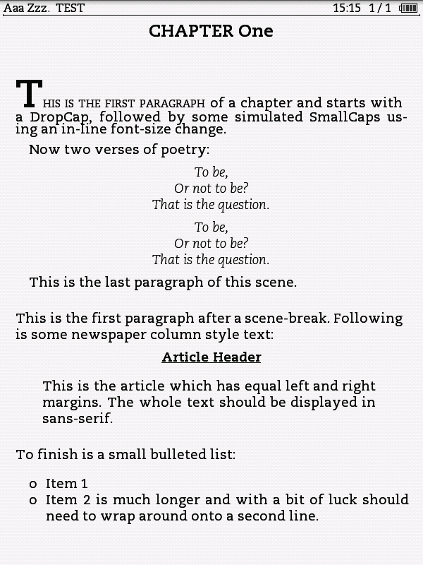 It's a long time since I used FBReader (on my PocketBook 360), but I seem to remember it completely obliterated the styling niceties. I never did get round to trying CoolReader. It's quite possible both apps have improved a lot. I've attached a one-page epub containing various typical styles found in epubs. The default Sony app displays all styling with no problems. I've also attached a screencap of what it looks like on a Sony 650 (I didn't use the T1 because I don't have a screencap app for it, but I'm pretty sure I can make it look exactly the same.) Edit: I should add that I have used a customised font, not the Sony default. If anyone can spare the time I would love to know how close to the original you can get using one of the Android reading apps. I haven't rooted my T1 yet as I haven't seen a 'killer app' which will tip me over the edge ![]() In addition, for any Calibre fans who use either the Catalog or News features (both highly styled epubs), are any of the Android reading apps practical at all? Last edited by jackie_w; 01-05-2012 at 04:02 PM. Reason: add |