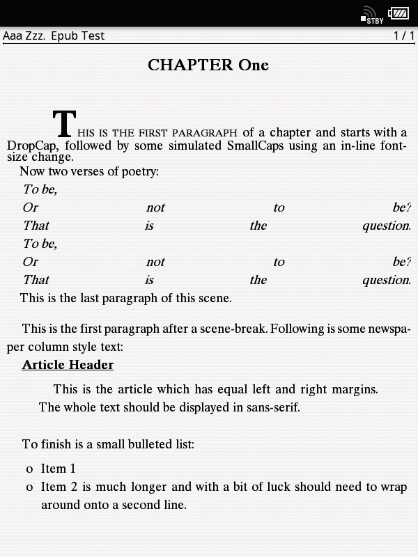 It's a long time since I used FBReader (on my PocketBook 360), but I seem to remember it completely obliterated the styling niceties. I never did get round to trying CoolReader. It's quite possible both apps have improved a lot. I've attached a one-page epub containing various typical styles found in epubs. The default Sony app displays all styling with no problems. I've also attached a screencap of what it looks like on a Sony 650 (I didn't use the T1 because I don't have a screencap app for it, but I'm pretty sure I can make it look exactly the same.) Edit: I should add that I have used a customised font, not the Sony default. If anyone can spare the time I would love to know how close to the original you can get using one of the Android reading apps. I haven't rooted my T1 yet as I haven't seen a 'killer app' which will tip me over the edge ![]() In addition, for any Calibre fans who use either the Catalog or News features (both highly styled epubs), are any of the Android reading apps practical at all? Last edited by jackie_w; 01-05-2012 at 04:02 PM. Reason: add |