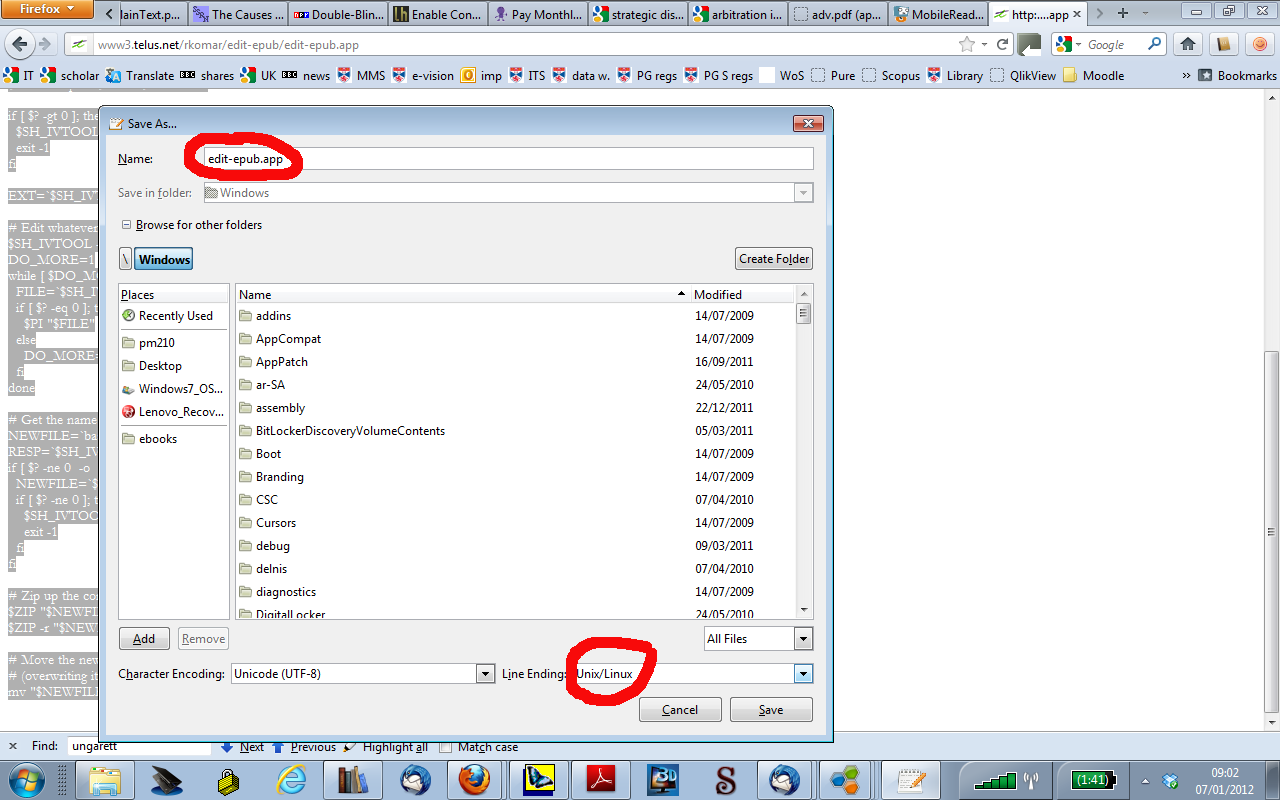 1) copy the text in the edit-epub.app webpage and paste it in a blank text file in e.g. notepad or similar (I use crimson editor); 2) save the file as "edit-epub.app"; 3) download and install gedit 4) open the newly created edit-epub.app in gedit and "save as" by selectin Unix/Linux end of line (over-writing the previous edit-epub.app file) but presumably it would go quicker at follows: 1) download and install "gedit"; 2) launch gedit, which automatically opens a blank file; 3) copy the text in he edit-epub.app webpage and paste it in the gedit window; 4) save as "epub-edit.app" selecting the Unix/Linux "end of line", instead of Windows (see picture attached) I am no geek, and anyone who feels confident in editing the .cfg file should have no problem with the above |