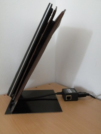 I did very simple cradle station. It is made by PCB FR4 material. It is the same material as the Printed circuits are made. The benefit of this material is that the parts are fixed together by solder. The cradle uses the original plug and adapter. The intention of this cradle is to simplify use of the Iliad connection to charger. |