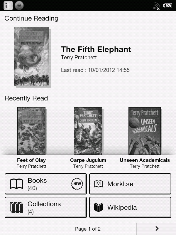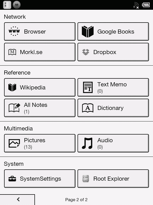I'm working on customizing the PRS-T1 in a different way than the SonyPrsT1Home project; instead of creating a new home screen I'm modifying the stock one (also: other stock Sony apps). Why? Because I like the look and layout of the stock home screen and it's a great way for me to pick up some Android and Dalvik knowledge. If you miss a certain feature on the PRS-T1, don't hesitate to say so! Latest version (Home and Reader) as of this writing: 2012-01-22 Main features