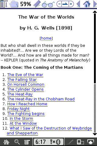 I caught an early preview of War of the Worlds last night in New York City at Loews in Times Square, and decided to kick of the weekend early for everyone else by making a custom conversion of the original H.G. Wells story to Plucker format for everyone to read. An early science fiction novel, The War of the Worlds (1898), by H.G. Wells, describes the fictional turn of the twentieth century invasion of Earth by aliens, from Mars, who use laser/maser-like Heat-Rays, chemical weapons (the Black Smoke), and mechanical three-legged "fighting machines" that could potentially be viewed as precursors to the tank. After defeating the resistance the Martians devastate much of eastern England, including London, before being unexpectedly killed by terrestrial diseases, to which they have no immunity. If you'd like your own shiny copy, feel free to vist the Plucker War of the Worlds page and download your very own. The book has been viewed as an indictment of European colonial actions in Africa, Asia, Australasia, and the Americas. Justification of the conquest of non-European peoples was usually along the lines of might-makes-right; i.e., the Europeans had vastly superior technology and so must be naturally superior people and so are perfectly justified in taking the lands for themselves. This argument gets flipped on its head with the arrival of comparatively technologically superior Martians who, according to the colonizers' own arguments, must therefore have every right to subjugate Europeans. Wells seems to have taken great pleasure in the fictional devastation of locations where he had spent an unhappy childhood. The book has been adapted as a famous radio drama, as a movie, and as a bestselling concept album, all of which have played some part in maintaining the public's interest in the original novel. The majority of the action takes place in the countryside of late 19th century southeast England. The narrator's hometown, Woking, is one of the many towns mentioned that lies on the outskirts of London. Other major action occurs near Southend, where the narrator's brother and his companions gain passage on a steamboat while fleeing to mainland Europe. If you find this useful, please consider donating to the Plucker project to keep quality works like this coming out. Spiffy screenshots below... |