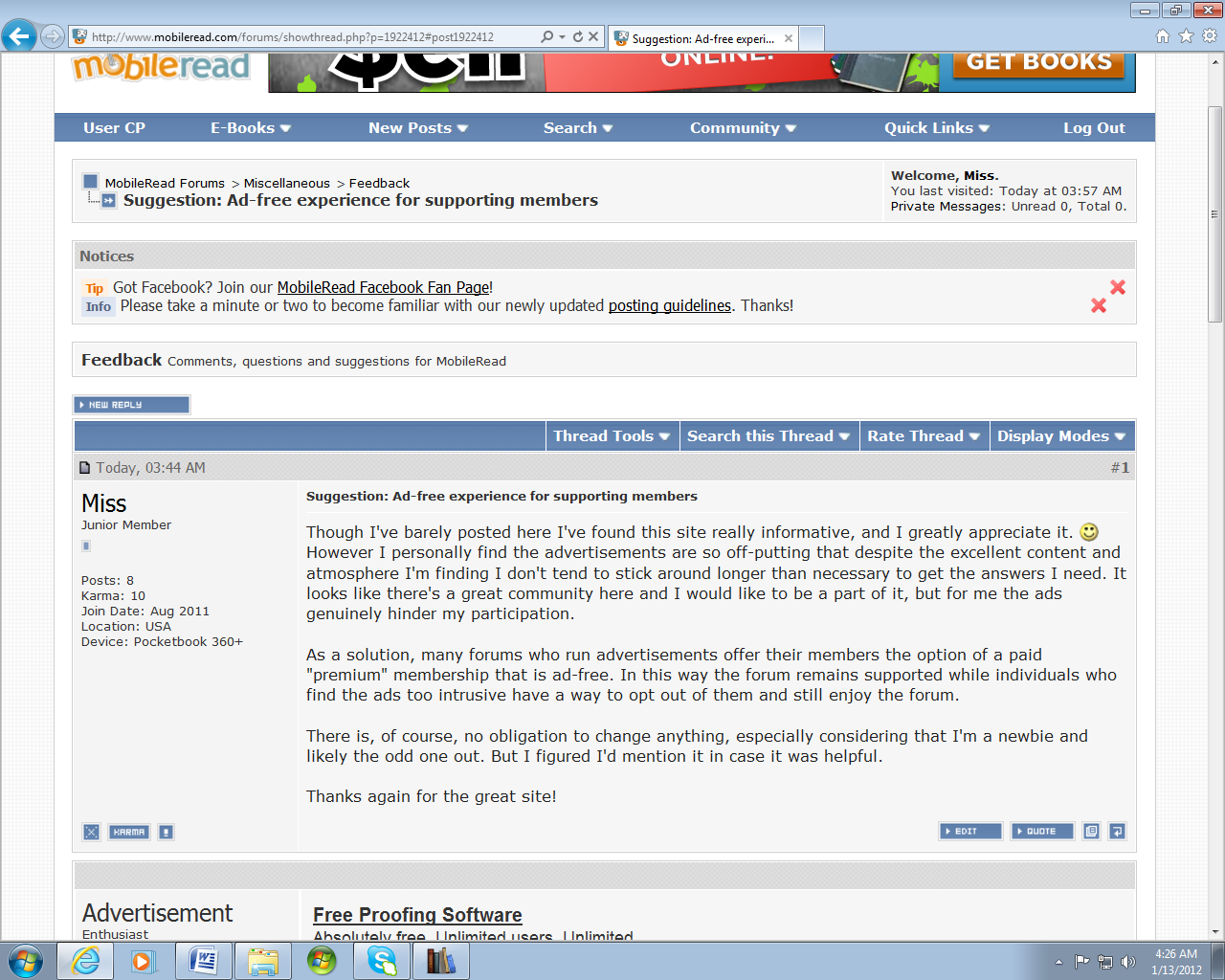 Edit: screenshot attached. One banner ad on top and one just below the post. Last edited by Miss; 01-13-2012 at 10:56 AM. Reason: spelling |