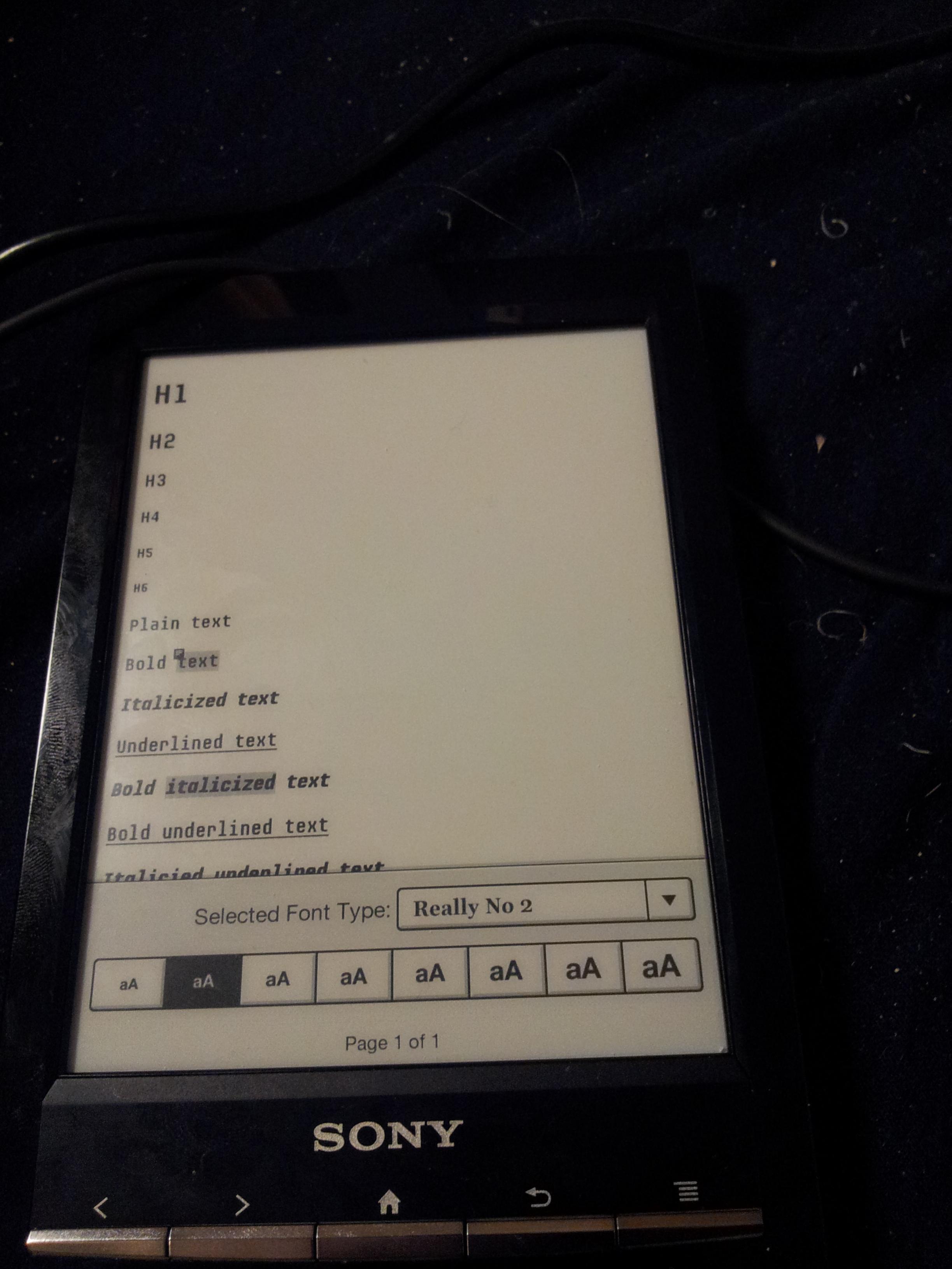 Fonts are specified in /sdcard/fonts/fonts.xml, and if that file is not found or cannot be read it falls back to the stock fonts. "Screenshots" attached, with exaggerated fonts to make it clear that it works (the reason "Bold italicized text" is not italicized in one of the images is that I had no bold-italic file for that font, so i set the bold file as bold-italic). As you can see, the "Selected Font Type" thingy does not show the custom font name for now; it consists of a bunch of hard coded button resources and so requires a bit of extra work to replace. File: http://morkl.se/reader/readermod_v2.zip (contains loose apk as well as installer for non-rooted devices; and fonts folder with sample settings) |