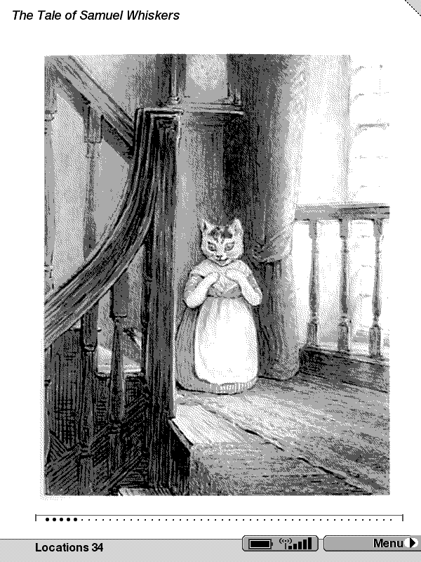 Attached are the originals and the associated Kindle screenshots for 3 jpg images. The first is a cover image from FeedBooks, its original size is 595x842 (37KB) and it gets rescaled just like images in the interior of the ebook. The last two are from bob_ninja's version of Potter, Beatrix: The Tale of Samuel Whiskers. v1, 16 May 2008, one is 931x1264 (117KB) and the other, in color, is 603x736 (74KB). All three images are relatively tall but this confirms the 520x640 actual size, the rescaling (maintaining aspect ratio) and the support for jpg's > 64KB. There is a noticeable pause before displaying a page containing an image, but illustrated ebooks work well on the Kindle. It is a shame that some professionally produced ebooks have much smaller images than those shown here.