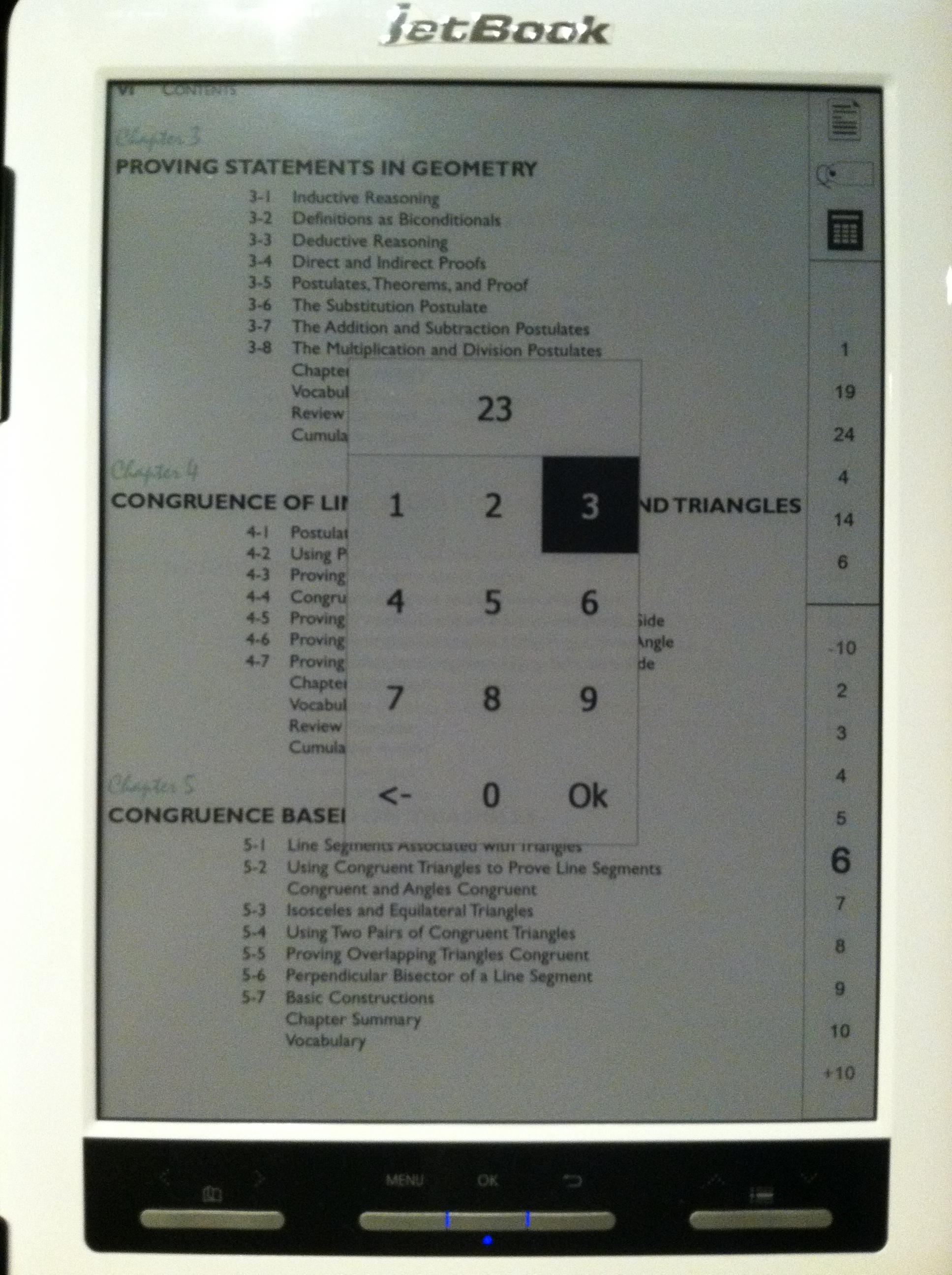 It's a sub-menu accessed by double clicking on the right side of the screen. I'll go through the steps below with pictures: Open to a page in a PDF (I've checked with the books in FB2 they loaded and it works there too, if anyone else has any other formats let me know): Lightly double tap on the right side of the screen and this menu pops up!: Now, the bold number at the bottom represents what page you're on. You can jump to any of those numbers by clicking on them (they range 4 numbers before and 4 numbers after the page you're on) or you can use the "+10" and "-10" buttons to add to the list of pages to jump to. Above that are pages that you've already visited - i jumped around so as you can see my recent page visits are jumbled in numbers. Now there are 3 pictures at the top right, in descending order i'll describe them below: The 1st one (and the coolest) is the Table of Contents: It breaks down chapters with chapter titles so you can jump from one to another. Pretty convenient when a teacher might say "Now class, go to chapter 4." The 2nd one is bookmarks. Now i only bookmarked one page to show the function, but you can probably do this to however many pages you like. What's interesting is that a virtual keyboard popped up and let me title the bookmark itself. Since the page was about line segments, i titled it "Line Segment." (When i did this in FB2, it gave me the page number followed by the first words on that page), and this is how the lonely 1 bookmark looks: The 3rd function is a "Page Jump" feature where a block of numbers pops up on the screen and you input what page you want to jump to: If anyone else finds anything make sure to post! There's not a lot of info on the functionality of the device yet so i'm interested in seeing what other features they've locked up in here