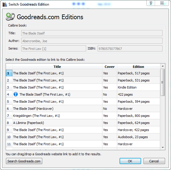 Hope maybe it can be put into simple linking too (to see which edition is chosen), but I usually download goodreads ID with metadata so I rarely need to link manually. And now it's easy to change editions. The only problem could be in changing edition while in goodreads it remains the old edition. So you need to change both. Maybe there is a way to check which edition is on the shelves? I often add books on goodreads manually (like my to buy list or the books added before I started using calibre or the books I see my friends reading etc) so edition in calibre and goodreads are often different. Downloading/syncing often shows which since you get no results for those books. Unless you end up with duplicates on goodreads. Which can be removed in batch edit in case somebody doesn't know. And again you need to see which edition is in calibre/ which to keep. |