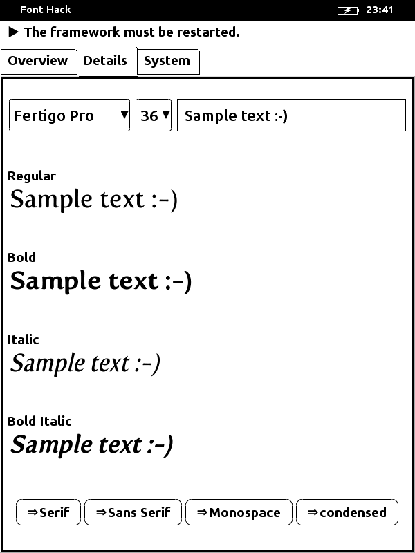 .Good to know they use fontconfig more or less properly .For those trying to figure this out, you might also want to check the fontconfig stuff in the K3 fonts hack (I went with a config a bit more intrusive, but the simple match->assign on the default font family used here is a neat idea ).I still plan on checking this (ie. Fonts on the Touch) out in detail, as soon as they're available on the French KS... -_-". One other thing to check: If you use a font with bigger glyphs, and a part of the UI text overruns, does it still horribly breaks the UI, or is the text cropped? Last edited by NiLuJe; 02-12-2012 at 02:10 PM. |