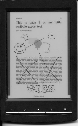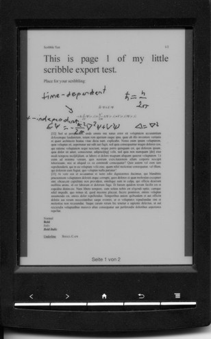For my first tests, I decided to stick with Windows as operating system and tried to avoid to install a lot of additional software. Already on my computer: LibreOffice (for its "export to pdf" functionality), PDF24 (a tool to merge pdf files, something similar should work too), Inkscape (vector graphics editing) Additional installs: SQLiteSpy (reading of Sony's books.db), NoteToSvg What I tried: For testing purposes I made a simple pdf file (Scribble Test - original.pdf) with LibreOffice Writer and transferred it to the PRS-T1. I added a few free-hand annotations (see With SQLiteSpy I looked for the id of the free-hand annotations in books.db and exported the respective files in /Sony_Reader/database/cache/books/BOOK_ID/markup with NoteToSVG. Then I opened both the first page of the pdf file and the svg file with Inkscape, grouped all elements of the svg and copied the illustration to the window with the pdf (for some reason I had to resize the graphic, so it might be a good idea to mark two corners when annotating on the reader to facilitate aligning). I saved the file as pdf and did the same with the second page. Both pages were merged with PDF24. As you can see, the resulting pdf file (Scribble Test - annotated pages.pdf) doesn't look too bad - simple text is fine but there are some obvious problems with equations (that were not properly imported by Inkscape). However, it's too much time and effort to do this for complete textbooks or even epubs. |
