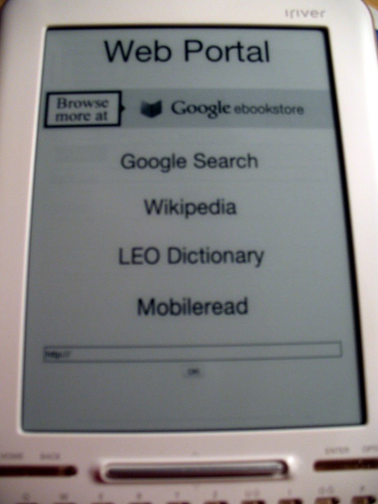 Warning: This mod works fine for me, but I can't guarantee it will work for you. Use at your own risk! This mod puts a portal page in front of the regular Google ebookstore. There you can select various links such as Google or Wikipedia. The ebookstore remains usable - it can also be selected. The portal is stored in the internal memory as webportal.html, so you can easily adapt the link selection to your personal needs. You should backup that file though as it's overwritten every time you (re)install the plugin, and deleted when you uninstall it. To use, rename the attached hex file to storyeb07.hex and copy it to the internal memory (like a regular firmware update). This change can also be reverted by using the attached Undo file. This will also delete the webportal.html file. The reader requires an additional reboot after installing or uninstalling this mod. Once the update / boot process is finished (when you're back in the readers main menu), hold the power button for about 5-15 seconds until the reader turns off. Then turn it back on and the mod should be active. Updated on 02 Mar 2012: The mod now has simple download functionality for http and ftp. Unfortunately, it doesn't support https or sites that require a login. This can be used to download ebooks from a local Calibre server, if it's not password protected, or attachments in a forum, if the forum allows guests to download. Downloads will be stored on the SD card, in a folder called "download", which has to be created by you beforehand. The downloads run in parallel in the background, there is no visual feedback as to the download's progress. Running downloads are cancelled when the reader goes into standby. Compatibility Notice: If you are using firmware 1.33 US or 1.34 US, iriver removed access to the web browser in those. A downgrade may be possible using this: https://www.mobileread.com/forums/sho...d.php?t=212233. Also, the device has to be signed into Google for it to start the browser. Regards frostschutz Last edited by frostschutz; 05-11-2013 at 12:55 PM. |