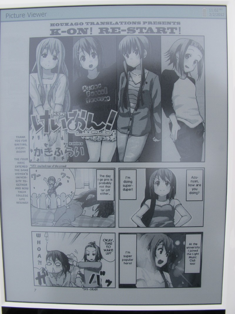 As both a lover of gadgets and a reader of manga (Japanese comics), e-readers have always appealed to me. A quick search online for the best e-reader for manga however, often brings up the same complaints, the screens are too small and zooming plus scrolling is frustrating. The JetBook Color however has all the makings of a perfect manga reader; huge screen, high resolution, and even color! Can a device primarily aimed at the educational market actually provide what we dream for though? Let’s see… Starting off with the physical design, while the box and website show a black JetBook, at the time of writing (Feb 29th 2012) only the white version is available. That’s a shame because the actual e-ink screen is quite dark, and it seems even darker with a bright white surround. Overall though, the device feels very solid and well built, with the exception of the roughly cut “JetBook” sticker on the top. I particularly like the textured back of the unit, which unlike the rear of all metal or plastic e-readers, adds some real grip. The unit itself is quite heavy, weighing in at 662g (23.4 ounces). Taking its size into account too, this isn’t something to hold with just one hand like any 6” e-reader. The dimensions are 188 x 270 x 11.5mm (roughly 7.4 x 10.6 x 0.5 inches). To compare, 2009’s Kindle DX is 183 x 264 x 9.6mm, and 540g (18.9 ounces). That’s almost the same physical size, but nearly 20% lighter. For reference, the iPad 2 comes between them, at 600g (1.33lbs) but with a smaller design of 186 x 241 x 8.8mm (7.3 x 9.5 x 0.34 inches). Screen wise, each of those three devices mentioned share a 9.7” screen. Where they vary is in the resolution. The iPad 2 has 1024 x 768, the Kindle DX steps it up with 1200 x 824, but the JetBook Color packs a whopping 1600 x 1200 pixels in its screen. This makes it, by a huge amount, the highest resolution e-reader ever produced. No doubt the iPad 3 will put that to shame this week, but that’s an LCD screen, not e-ink. To put this into perspective, the JetBook Color has nearly the same overall number of pixels as a Full HD TV, only tightly packed into a sub 10” screen. That high resolution screen is a winner when it comes to reading manga. Without having to zoom or scroll, you can comfortably read even small text on the pages. I never felt like it would be nice to zoom a little closer, or make things a bit sharper. This is a relief, because zooming around a PDF is anything but ‘zooming’. Having to refresh the entire screen with each button press as you scroll around is just agonizingly painful. With e-ink’s slow refresh rate, scrolling simply isn’t practical, but furthermore since you have to use the arrow keys instead of the touch screen, what once seemed a cutting edge piece of technology suddenly feels like something that belongs in the early 1990’s. For those few who do try the zoom feature, an odd quirk is that the menu button only works when you zoom out, not in. But let’s just be thankful once again for the high resolution 9.7” screen, and never touch that zoom again. And that is why we don’t read manga on a 6” screen. Images (jpg, gif, bmp) seem to respond better to zooming at first, with the up and down arrows giving you quick zoom control. Then you realize that you can’t pan around the image unless you go into the menu and enable panning mode, which of course takes the zoom feature away from the arrow keys. It’s back into the menu yet again to change the amount of zoom. Then, after you’re all done, it resets itself when you go to the next image. Sadly, so does rotating the image to landscape, which is an option with images (but not PDFs). Considering the $500 price tag, it’s a shame it doesn’t automatically detect which way you’re holding it and rotate things for you. Especially given that the included case, which turns into a stand, is a landscape one. As all the menus are stuck in a vertical direction, a case that turns into a horizontal stand seems like an odd choice and won’t get much use. If you’ve ever used an e-ink screen before, you’ll know you can sometimes see a faint after-image of the previous page. How much of an after-image seems to vary between e-readers and whether the screen fully or partially refreshed. A partial refresh, where only the part that changed is refreshed, is great for menus as you move your cursor around, but seems to worsen the after-image problem. From what I’ve seen of the Kindle, the after-image effect seems a bit stronger on the JetBook Color, but generally as you’re reading, it’s not a problem. It just spoils the view as you look at the cover, seeing a faint imprint of the book selection menu across the image. Again though, rarely did I think this was a problem while actually reading manga. The full screen mode is a handy option for manga readers, and if you’re resizing images, you know exactly 1600 pixels high will produce the sharpest results. The JetBook Color’s claim to fame is of course, in its name. Despite the brightly colored images you’ll find of it on some websites though, e-ink colors are quite pale and dull. That’s just the nature of the technology, without a back light to brighten up those colors. Understanding that, what color it does add is a fantastic step forward to e-ink based e-readers. Even though it’s more of a touch of color, it makes a big difference over the usual grayscale images. In fact it makes me wish more manga was produced in color. To get the best out of the color display, view it outdoors under some good strong sunlight. Outdoors, where the iPad struggles, the JetBook Color shines. Above: JetBook Color vs a regular LCD screen Storage wise, with 1.6gb of usable on-board memory, you’ll quickly want to get a MicroSD card to hold more manga. With support for up to 32gb, this is a giant advantage over the Kindle DX. Amazon’s reader includes 4gb of storage, 3.3gb of which is usable, and no option to add mor