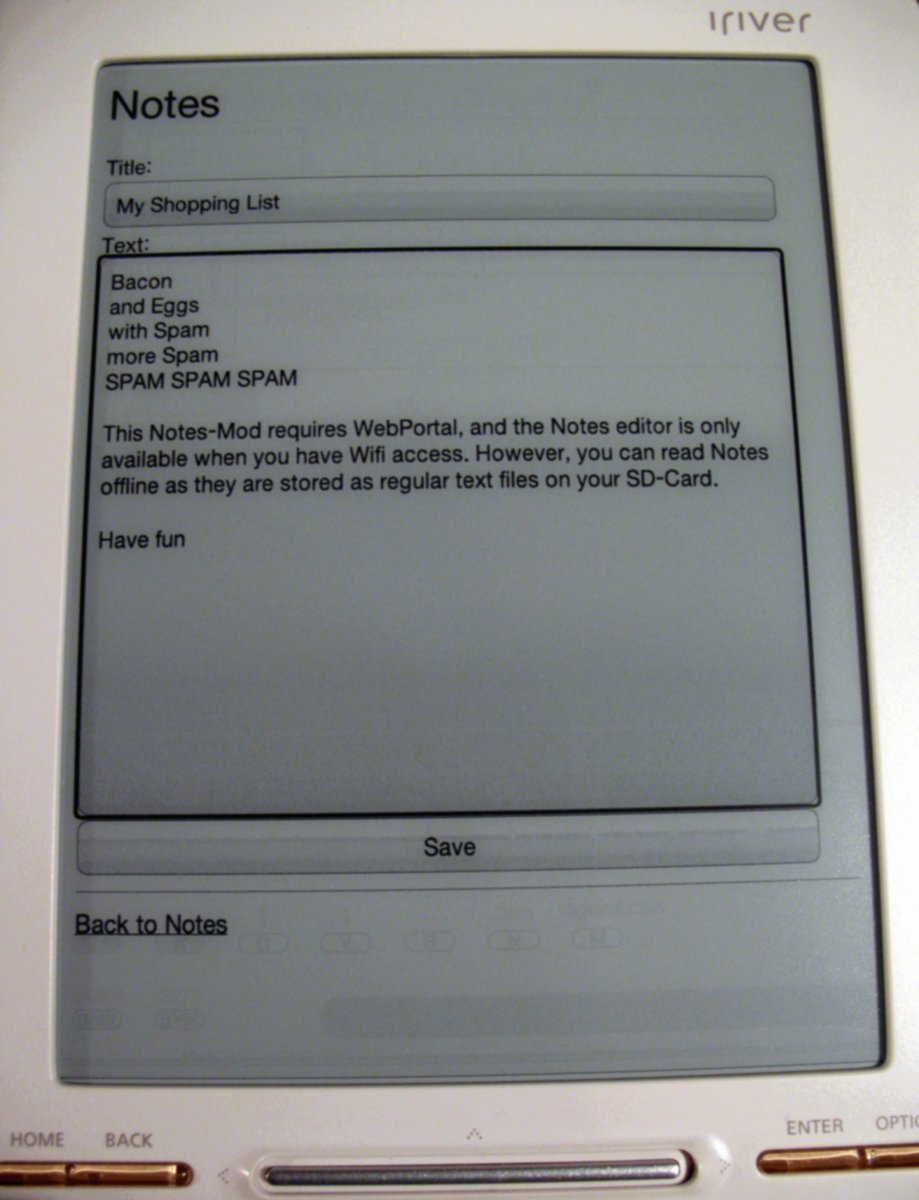 Warning: This mod works fine for me, but I can't guarantee it will work for you. Use at your own risk! This mod enables you to write Notes on your Story HD, using the built-in webbrowser. This mod requires the WebPortal to be installed also, as otherwise the webbrowser can not be used. Unfortunately, this also means that you have to have Wifi network access in order to take notes. The Notes are stored in a folder called notes on the SD card. They are regular textfiles, so you have read-only access without Wifi, and you can easily transfer them to your PC. To use, rename the attached hex file to storyeb07.hex and copy it to the internal memory (like a regular firmware update). It can also be uninstalled using the attached undo file. You will also have to edit your webportal.html to include a link to the notes app. Insert the following HTML code into your webportal.html so you can actually select it in the portal: Code: