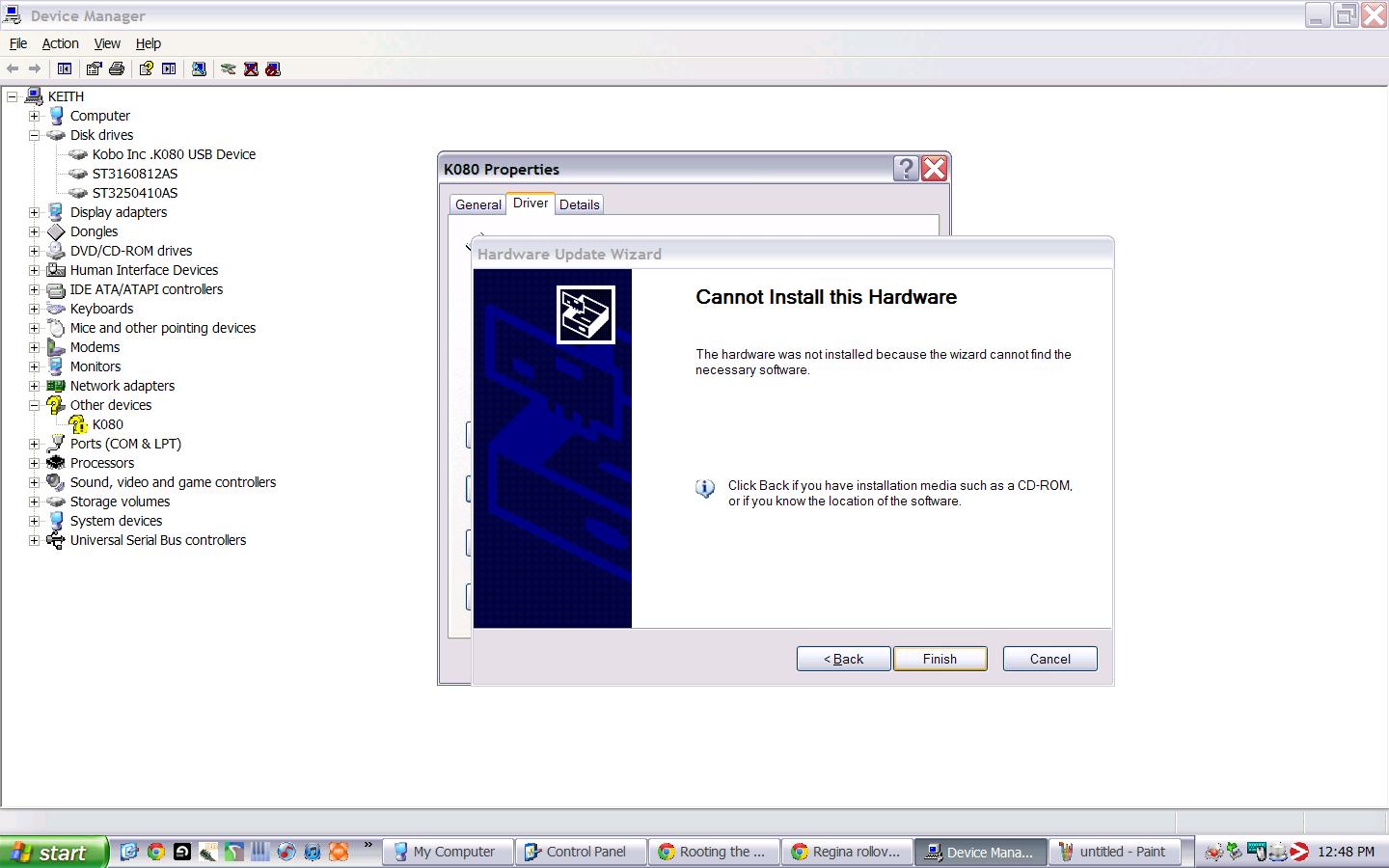 Excellent, we are at exactly where we should be. You need to specify the driver for windows at this point. So, finish the wizard, go to the properties of the K080, then say update driver. Dont let windows automaticaly find the driver, you need to specify the folder C:\temp\ZergRush-forKobo\usb_driver. Windows might say the driver isn't compatible so you have to force in the ADB interface driver. |